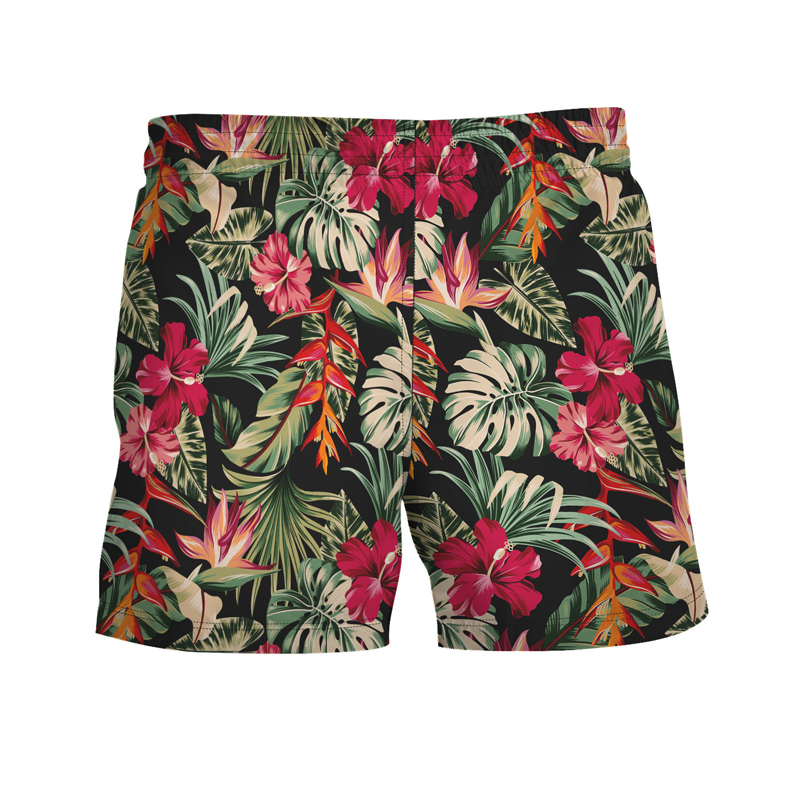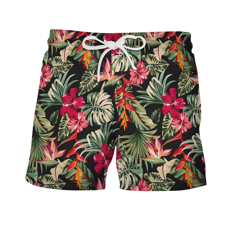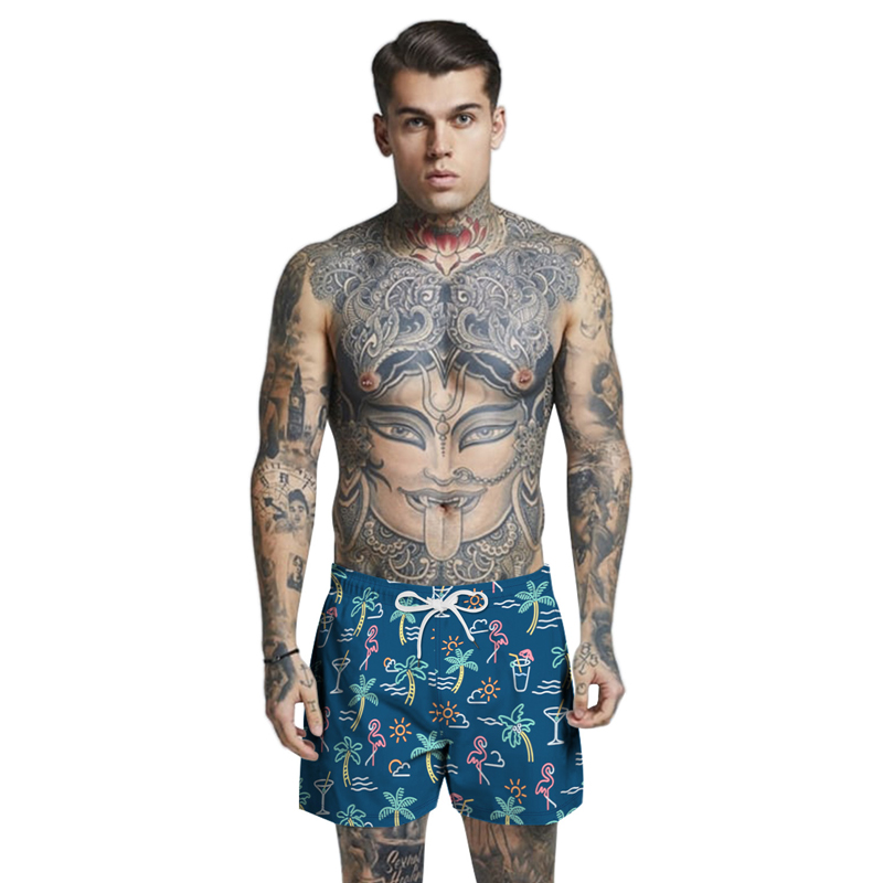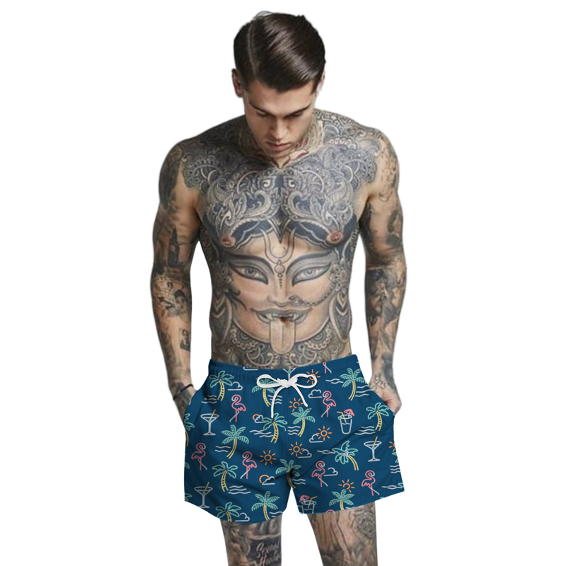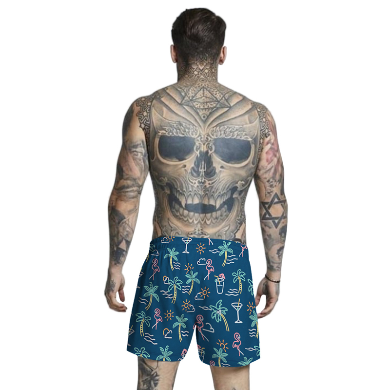 Rich textSummer Coconut Tree Flamingo Cartoons Print Beach Vacation Shorts Men Casual Drawstring Bathing Shorts Net Inside Shorts Mens