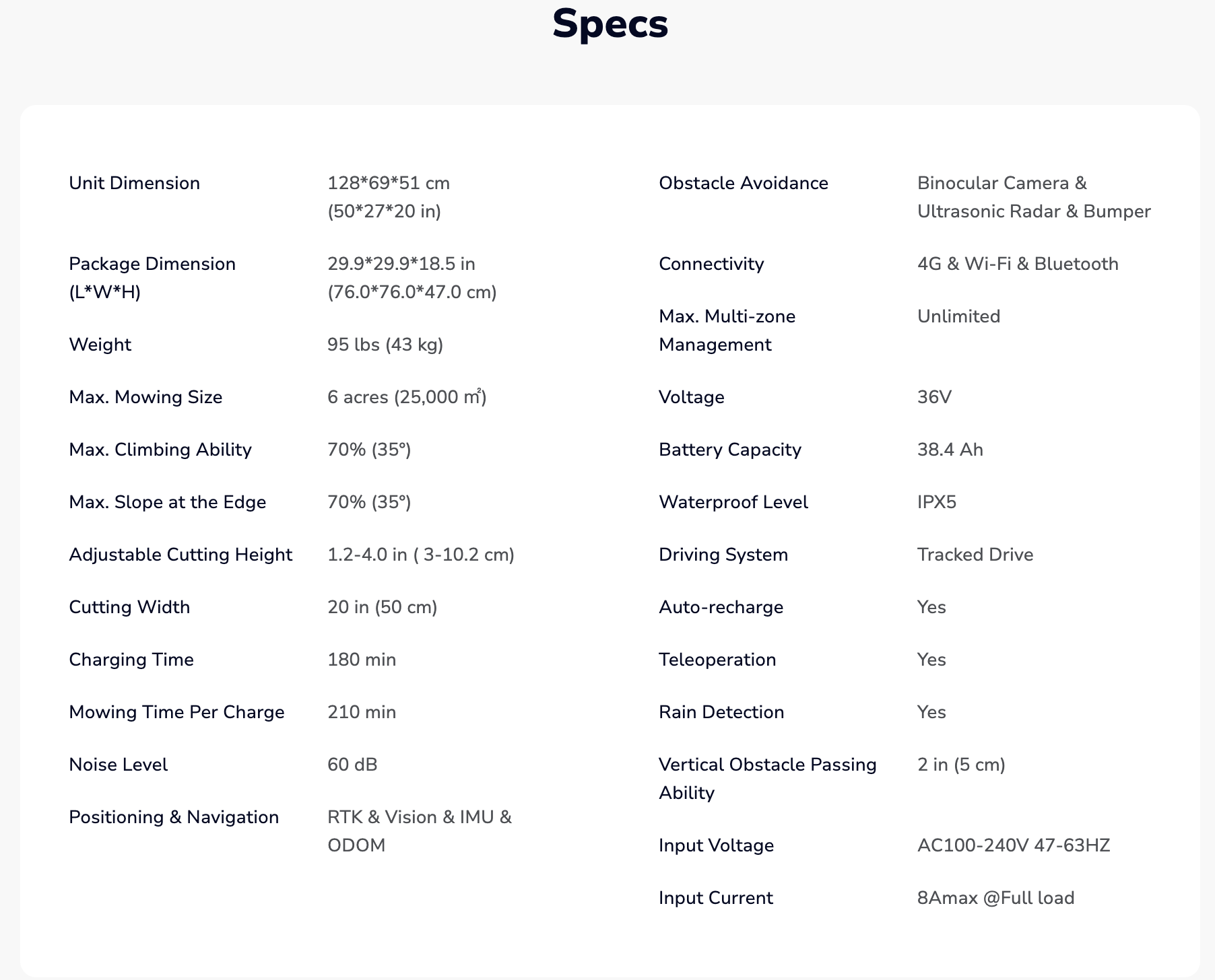 Combines GPS and AI for efficient mowing patterns, ensuring complete coverage and a uniform cut.
